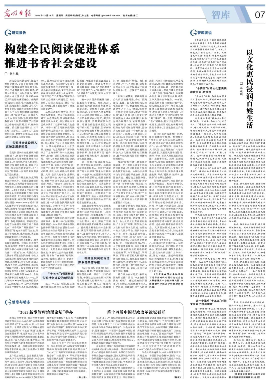 深化全民阅读活动,推进书香社会建设,是关乎国家文化繁荣与民族精神培育的战略工程。它不仅承载着提升国民素养、增强文化软实力的时代使命,更是推动社会文明进步、促进精神生活共同富裕的重要途径。“全民阅读”连续12次被列入《政府工作报告》,成为国家长期战略。《中共中央关于制定国民经济和社会发展第十五个五年规划的建议》明确提出,要“推进书香社会建设”。12月16日发布的《全民阅读促进条例》以立法形式明确了全民阅读工作的相关原则、目标、任务和措施。持续推动全民阅读,对于实现“以文化人、以文育人”、坚定文化自信、赓续中华文脉,具有深远的历史意义与现实价值。