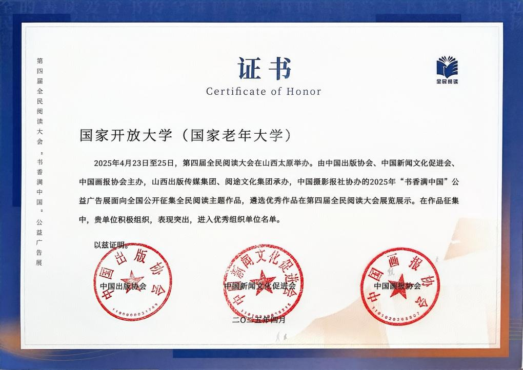 三年来,国家开放大学读书行动的影响已远超校园范畴,产生了广泛的社会影响。在第四届全民阅读大会“书香满中国”公益广告展中,国家开放大学报送的《全民阅读 终身学习》系列海报和《草原书香》《数智书香润边疆》主题摄影入选参展。这些作品以多元视角诠释阅读的力量与温度,体现了国家开放大学在弘扬阅读文化、推广全民阅读、传递读书力量的经验和特色。
