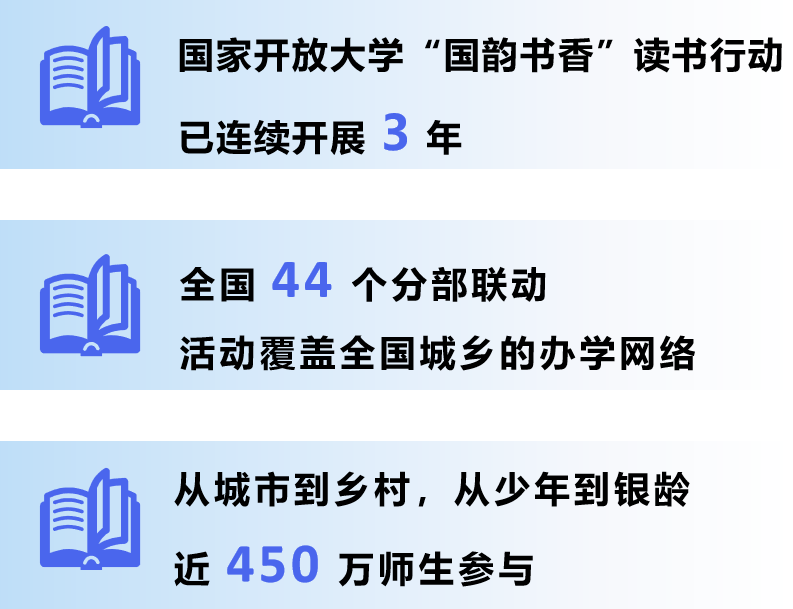 三年来,这一读书行动已成为国家开放大学办学体系内参与度广泛、影响力强大的文化品牌,直接覆盖近500万师生。
