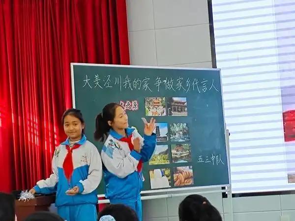 兰州市东郊学校与泾川县中街小学联合开展教研课《夸夸我的家乡》,两名五年级学生主持活动。