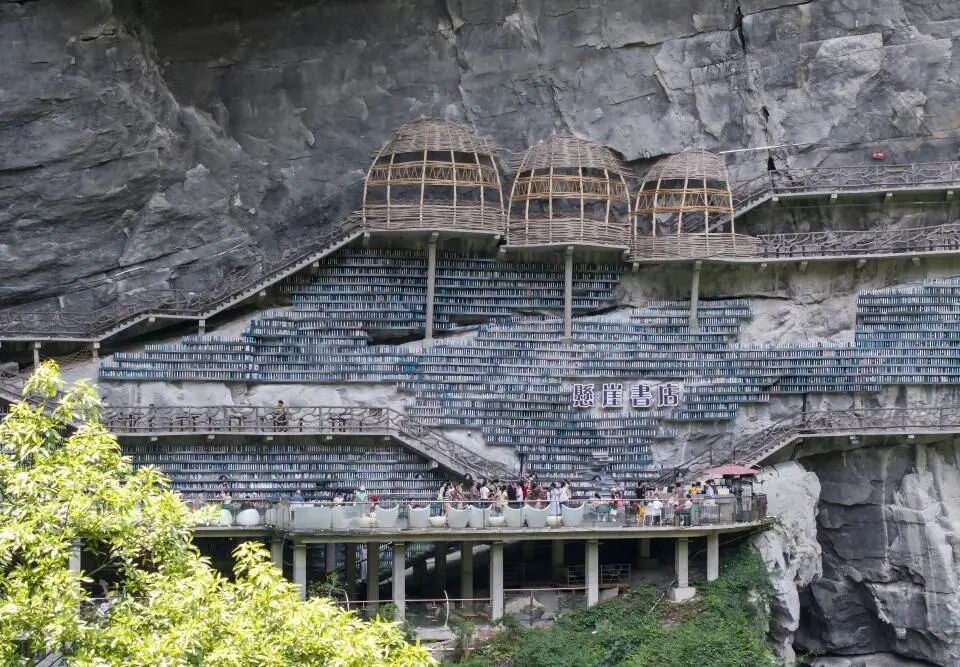 ▲游客在广西河池市罗城仫佬族自治县棉花天坑景区内的悬崖书店。新华社发(龙涛 摄)