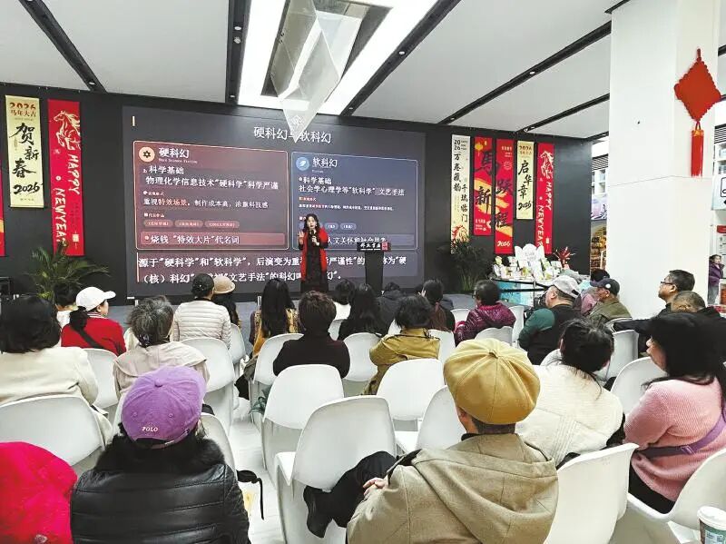 ▲近日,湖北省外文书店内,“穿越想象之门——科幻影视与文学中的无限可能”阅读分享会吸引众多读者参与。